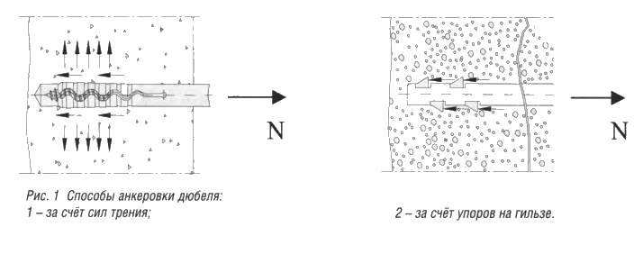 Каждому типу оснований подходят определенные дюбели. При работе с бетоном, железобетоном и полнотелым кирпичом используются уплотнители, удерживающиеся за счет силы трения. Формирование соединений в рамках пористых блоков подразумевает применение крепежей с габаритными стопорами.